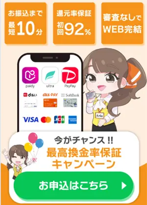 | おすすめ ポイント | 初回換金率 92%保証 | 2回目は 3万円もらえる | 手数料 無料 |